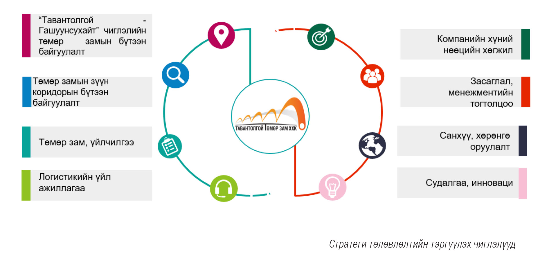 “Тавантолгой төмөр зам” ХХК өөрсдийн бий болгосон үйл ажиллагааны загвар, нөөц боломж, туршлага, давуу талдаа тулгуурлан “Төслийн удирдлагын үйл ажиллагаа”- наас “Төмөр замын ашиглалт, тээвэрлэлтийн цогц үйлчилгээ” үзүүлдэг компани болж өсөн дэвших, өргөжин хөгжих зорилт тавьж, энэхүү зорилтыг хэрэгжүүлэх үйлст хамт олныхоо хөдөлмөр зүтгэл, хүчин чармайлтыг нэгтгэн зангидах үүднээс урт хугацааны хөгжлийн бодлогын баримт бичиг болох энэхүү стратеги төлөвлөгөөг боловсруулсан билээ.